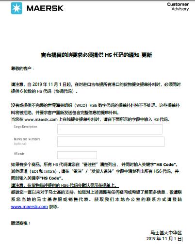 近日吉布提海關(guān)提出,自2019111日起貨物進(jìn)入吉布提所有港口均需要在提單上顯示HS代碼。MSK近日已經(jīng)發(fā)出通知。